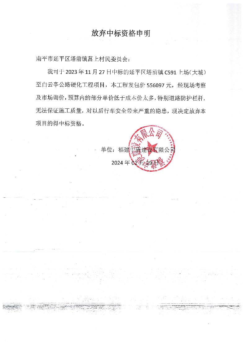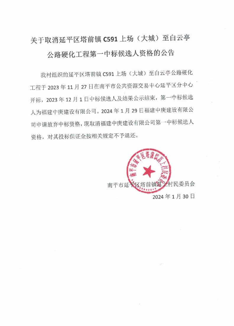 关于取消延平区塔前镇C591上场(大城)至白云亭公路硬化工程第一中标候选人资格的公告