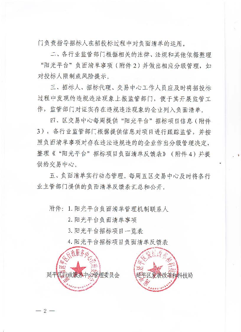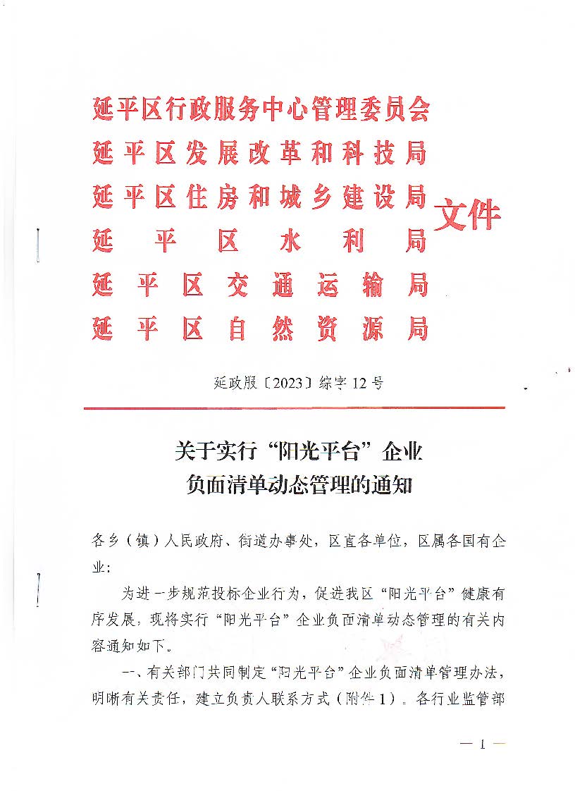 关于实行“阳光平台”企业负面清单动态管理的通知(延政服〔2023〕综字12号)